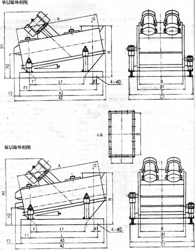 單層直線振動篩外形圖 型號 | A | A1 | A2 | A3 | B | B1 | C | C1 | L | L1 | F | F1 | F2 | H | H1 | H2 | E | ΦD | α |