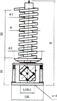ZC系列垂直振動輸送機的驅動裝置振動電機安裝在輸送塔下部,兩臺振動電機對稱交叉安裝,輸送塔由管體和焊接在管體周圍的螺旋輸送槽組成,輸送塔座于減振裝置上,減振裝置由底座和隔振彈簧組成。(見圖一)當垂直輸送機工作時,根據雙振動電機自同步原理,由振動電機產生激振力,強迫整個輸送塔體作水平圓運動和向上垂直運動的空間復合振動,螺旋槽內的物料則受輸送槽的作用,作勻速拋擲圓運動,沿輸送槽體向上運動,從而完成物料的向上(或向下)輸送作業。